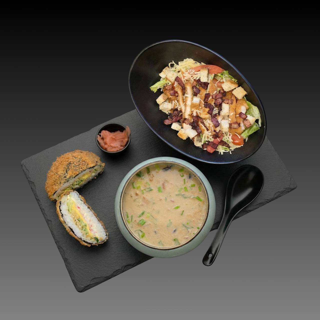 Tom yam sultinys, vištiena, udon makaronai, pievagrybiai, grietinėlė, svogūno laiškai.